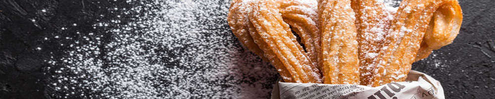Frittiertes Spritzgebäck mit Zucker übergossen und Schokoladensoße