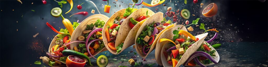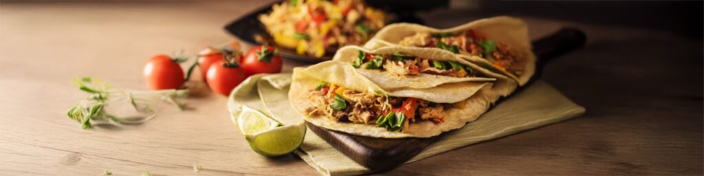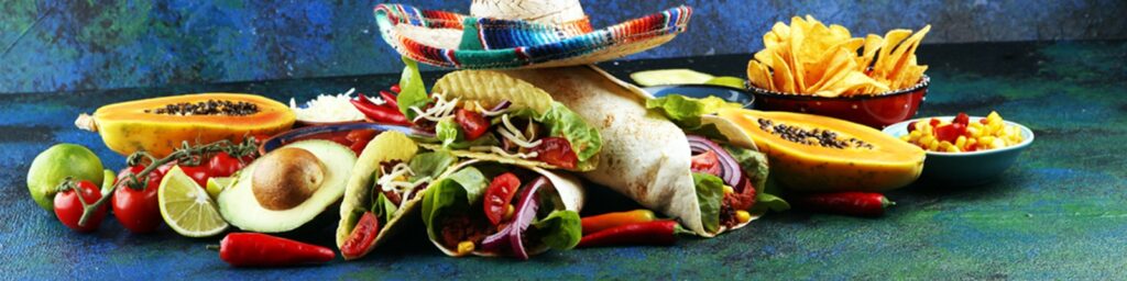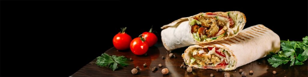 Weizentortilla gefüllt mit US Beefburger, Chedar Cheese, Tostada (Nachos), Pico de Gallo, Salat, Sauerrahm, Jalapenos